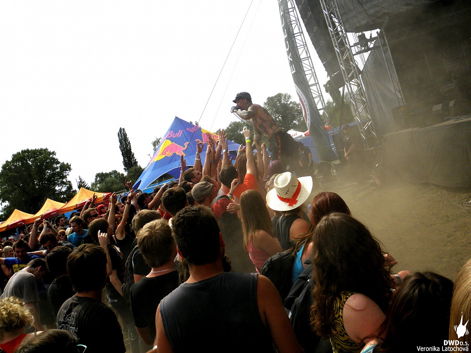 Neskutečné vedro, prach všude kolem vás, na vás, ve vás. Tohle vážně nikoho netrápilo. Když jsem v pauze při jednom songu zaslechla cosi o wall of death a circle pit, preventivně jsem si radši couvla.Věděla jsem proč :D Dav šílel a z létajícího prachu kolem se stával solidní vír.